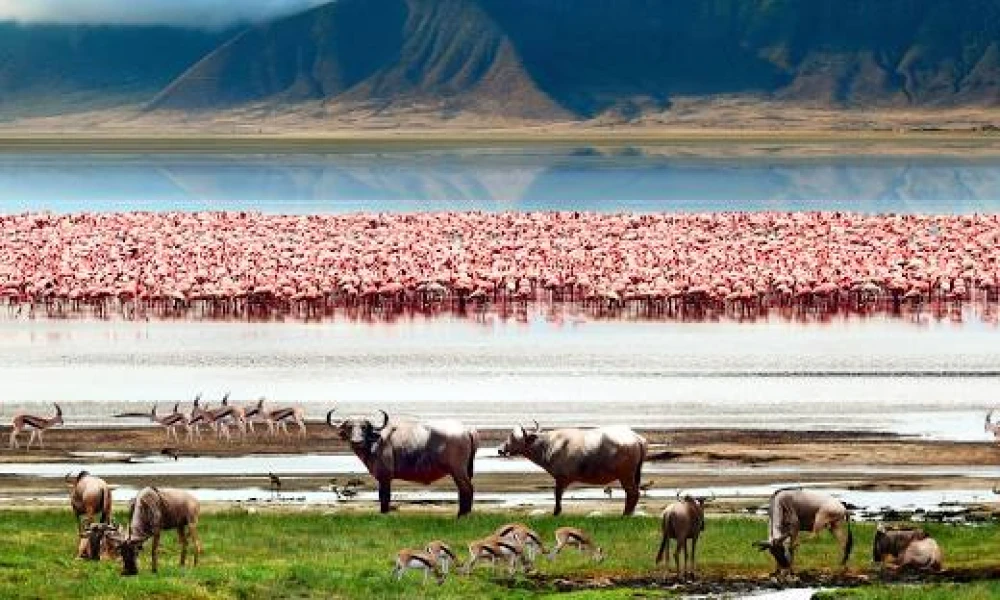 As you descend into the crater, you'll be amazed by the stunning scenery and the abundance of animals. You'll have the opportunity to see lions, elephants, rhinos, buffaloes, hippos, and a variety of bird species. The crater is also home to a large population of flamingos, which congregate on the alkaline lake in the center of the crater.